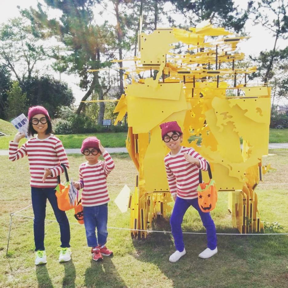 ハロウィンコスチュームでチェックポイントに指定された彫刻と写真を撮るとお菓子がもらえる、彫刻フォトウォーキング!