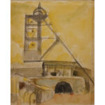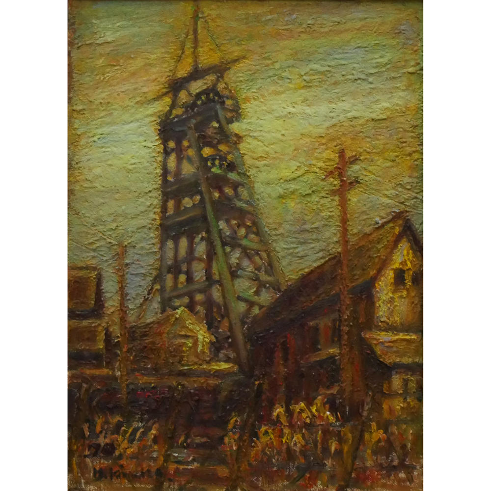 炭坑を描いた絵といえば、日本で初めてユネスコ記憶遺産の登録を受けた福岡県田川市の山本作兵衛を思い出す方も多いことでしょう。自らも炭鉱員であった作兵衛の絵は、炭坑での日々の労働と生活の様子を記録したもので、日本各地の炭坑には、それぞれに特徴のある炭鉱画が残されています。宇部市の石炭記念館に収蔵されている絵画は、主に1950年代後半から、最後の炭坑が閉山した1970年代前半にかけて描かれたもので、消えゆく炭坑町の姿を記録した風景画であることが特徴です。描かれた風景の中には、繰り返し竪坑櫓が登場します。宇部は海底炭坑であったため、地中深くにある石炭を地上に捲き上げるための櫓が、市内にいくつもありました。炭鉱の閉山とともにこの櫓も徐々に解体され、まちは炭都から工業都へと変貌を遂げていきます。櫓はいわば、地上から見える唯一の炭鉱町のシンボルだったといえます。