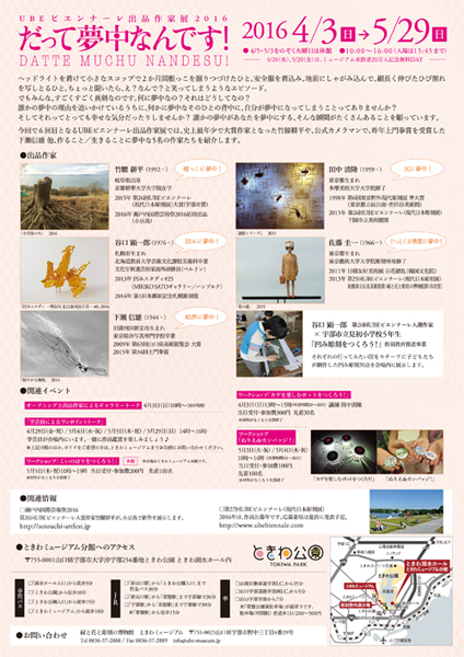 UBEビエンナーレ関連作家を集めた毎春恒例の企画展です。今年の春は、ベルリンと札幌を行き来しながら、世の中の凹みにかたちの面白さを見つける凹み彫刻家谷口顕一郎や、長い年月その土地に生きた木の根を、数カ月かけて丁寧に掘り出し作品にする京都精華大学大学院在学中の竹腰耕平ら、作ること/生きることに夢中な5名の作家たちを紹介します。彫刻、写真、映像、インスタレーション、約70作品による展覧会です。