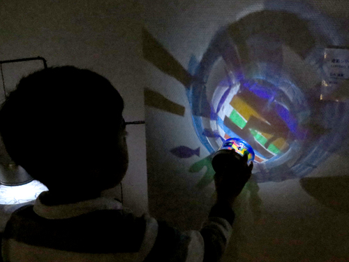 「だって夢中なんです!」展出品作家、光と影に夢中な田中清隆さんオリジナルワークショップ。好きな形に切りぬいたフィルムを透明なポットに貼り付けて、影を楽しむLEDライトを作ります。