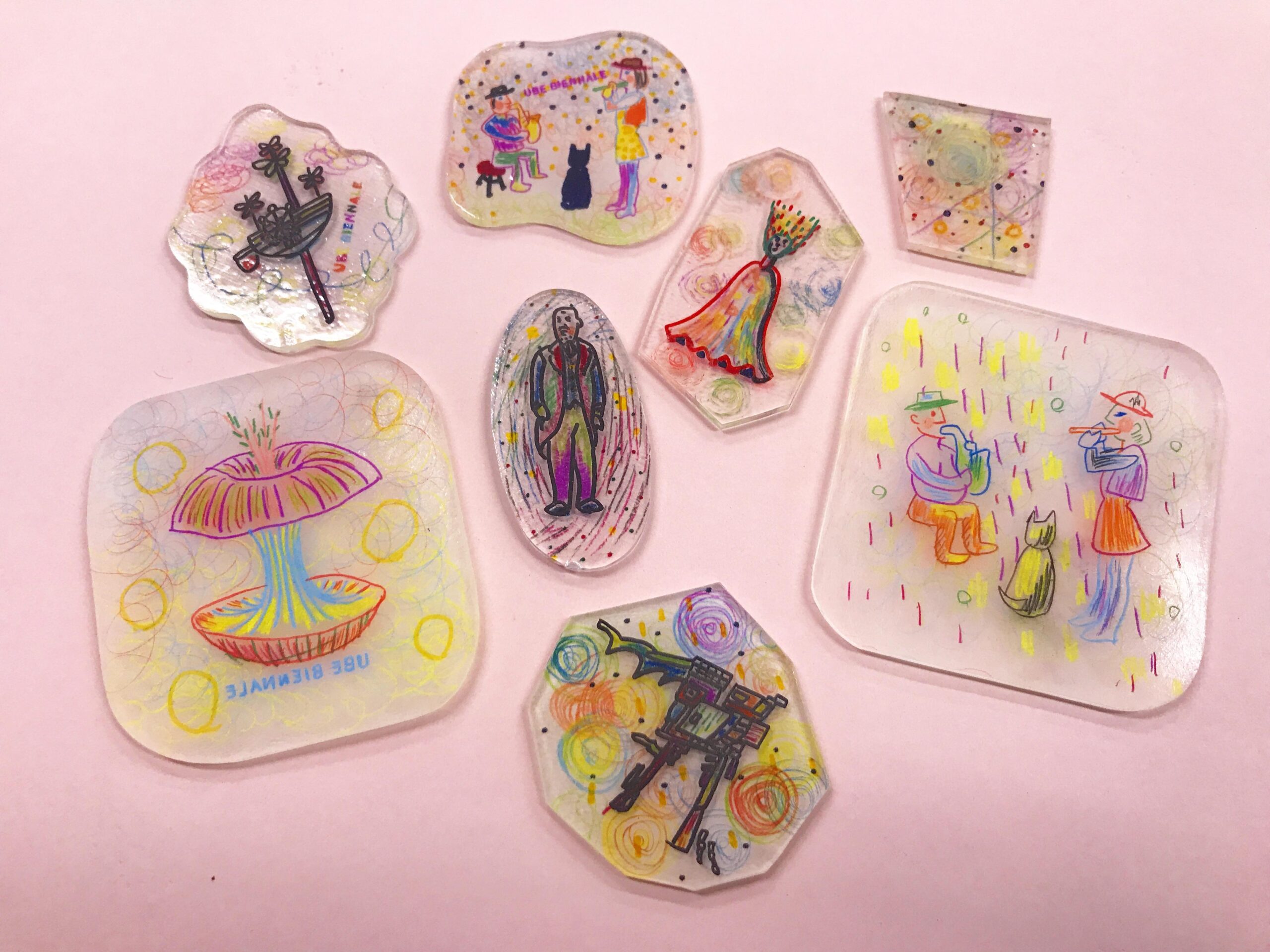 プラスチック板に絵を描いてオーブントースターで焼くと、縮んで丈夫になるよ!