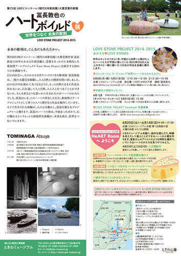 冨長さんのこれまでの作品や、昨年の5月にときわ公園からスタートしたLOVE STONE PROJECT2014-2015を通して、5000人を超える世界各地の人々と一緒に磨いたハートの形をした石120点を一堂に展示します。