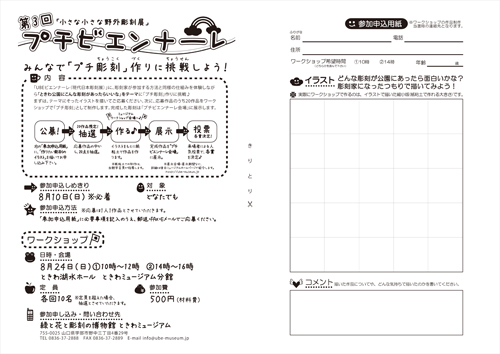 8月24日(日)のワークショップで応募イラストをもとに「プチ彫刻」を制作、第26回UBEビエンナーレ応募作品展会期中に作品を展示となります。