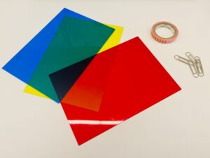 絵の具箱の中には、たくさんの色が入っていますね。たくさんある色も、色のもとになっている3つの色をつかうと、ほとんどの色を自分でつくることができます。からだ全体をつかって、たくさん色をつくってみましょう。