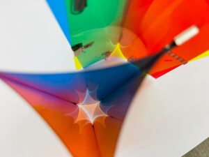 色つきの透明な板を組み合わせた「Gift of color」でのぞいた景色は、いろんな色に溶けて染まって見えるかも。