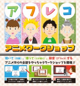 描いて(作画)、撮って(コマ撮り)、声入れする(アフレコ)、総合的なアニメ作りワークショップをお楽しみください。