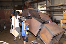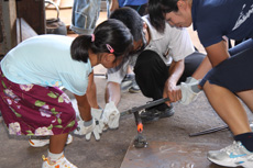 第23回UBEビエンナーレ’09の出品作家である山崎哲郎さんによるワークショップです。山崎さんが作品を制作している宇部市内の工場に行き、制作風景を見学しながら、作品についての解説をお聞きしました。その後、山崎さんと一緒に鉄の角棒をガスバーナーで熱し、実際に鉄を曲げたりひねったりして、鉄の面白さを体験しました。