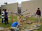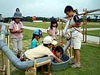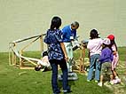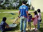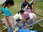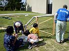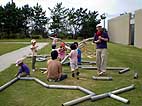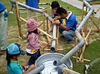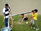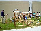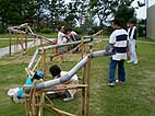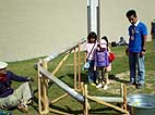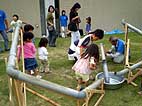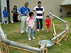 雨樋用の塩化ビニール製パイプをつなげて、その中をビー玉を通して遊ぶプレイング・スカルプチャー「ドロップボール」をみんなで作り、遊びました。完成した「ドロップボール」は現代日本彫刻展会期中展示を行い、鑑賞者が自由に遊ぶことができるようにしました。