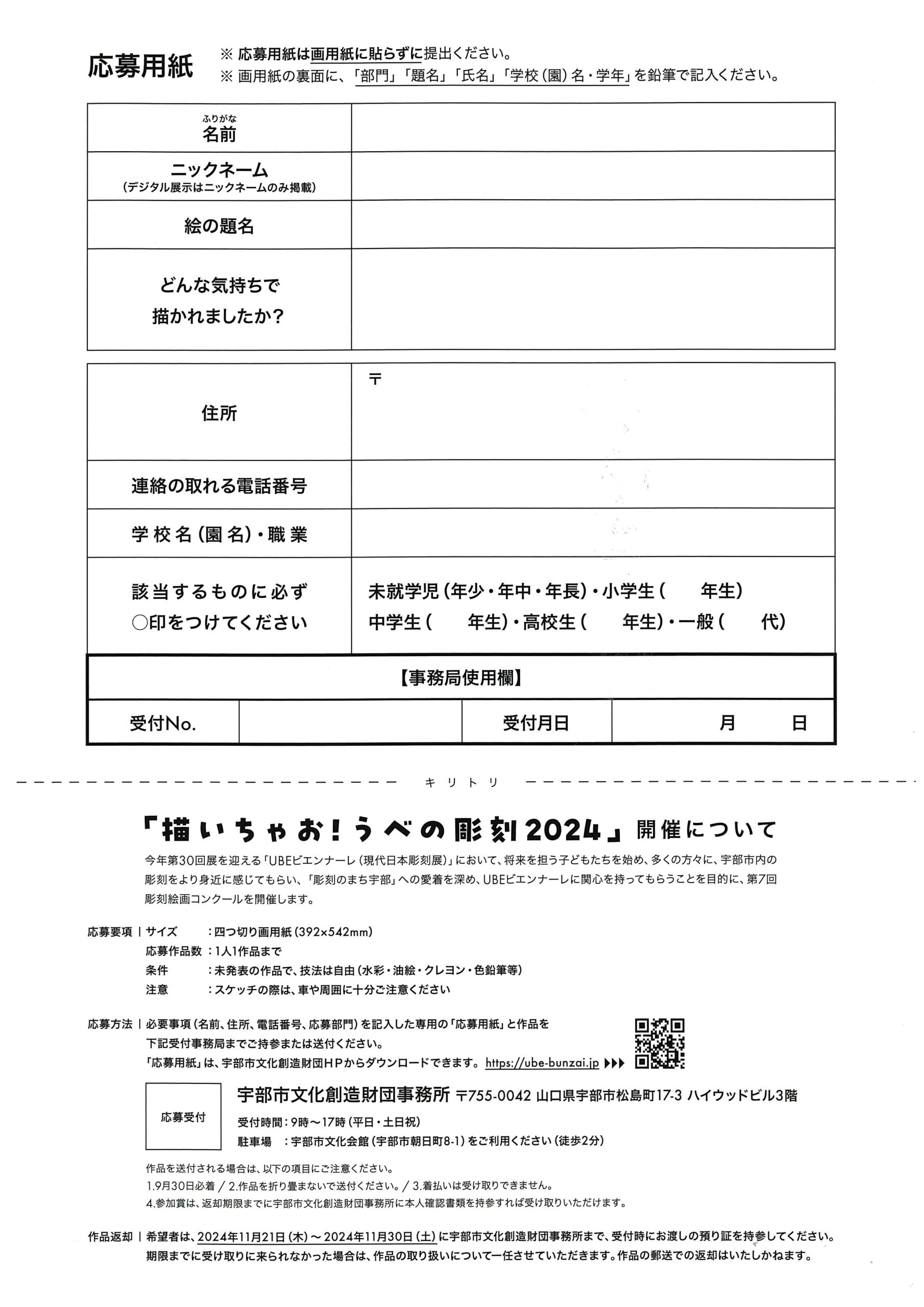 入賞者発表 | 2024年10月7日(月) 宇部市文化創造財団HP及び宇部日報紙面にて、題名・名前・学校(園)名・学年を掲載。 山本美月賞はUBEビエンナーレオープニング当日15時以降に会場にて作品を展示して発表。 |
