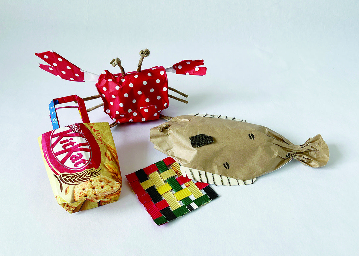 カラフルな包装紙や、印刷前の新聞紙など、なんだかきれい、まだまだもったいない!材料をつかって、ものづくりを楽しもう。