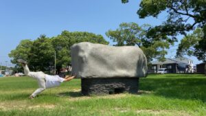 俳優でパフォーマーの渡辺芳博さんがまちの彫刻をめぐり「からだから観る」様子を紹介します。