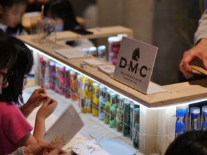 カウンターに並んだカラフルな刺繍糸をオーダーして刺繍してみよう。