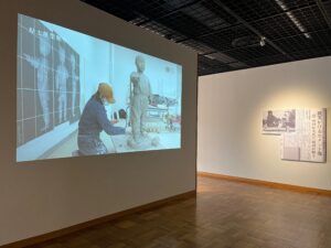当時のセメント彫刻の技法や山内の残した記録を参照し、セメント彫刻とその制作過程を記録した映像を制作した。かつて一般的であったセメント彫刻は、現在ではほとんど実践されていない。本作では、完成した彫刻だけでなく、その制作プロセス全体が当時を再演する舞台となっている。 《鳥とあそぼう》は、子どもが鳥(型のオブジェ)を手にして遊ぶ姿を表した像である。「子ども」と「鳥」は、「未来」と「平和」を象徴するモチーフとして、戦後の美術表現において繰り返し用いられてきた。山内が駅前の噴水彫刻にふさわしい主題としてこれらを選んだことは、その造形からも明確に読み取ることができる。また、風になびくベールや軽やかなポージングには、西洋美術におけるキューピッドや天使のイメージと重ねられ、エンゼル像と呼ばれることもあった。この作品には、西洋美術に見られる神話的で無垢な子どものイメージと、日本の戦後社会において「未来」や「平和」を託された子ども像とが、バランスよく交錯している。