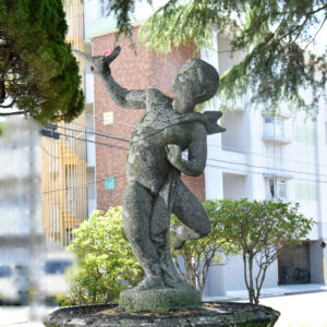 「鳥とあそぼう」は噴水彫刻として1960年に設置されましたが、1983年に同場所に澄川喜一「そりのあるかたち」(1981)が新たに設置されることとなり、現在の場所に移設されました。古い写真からはっきりとした質感は確認できませんが、表面が劣化し、一部鉄筋が露出したり、手の指先が欠損するなど、かなり劣化が進んでいる状態です。それでも鳥、おそらくはおもちゃを手にかかげ、飛ばして遊ぶような子どもの姿は無邪気で、心惹かれるものがあります。木陰でひっそりと苔むす様子も、哀愁を誘うようです。この作品をどうにかしなければならないと思いながら過ごすうちに、愛着がわいてしまったのかもしれません。「鳥とあそぼう」に使用された宇部セメントのフライアッシュセメントは、工場の集塵装置に集まった灰を原料にしています。公害の原因となっていた灰が、駅を皆守るアートになる、そんな記念碑的作品だったともいえるのではないでしょうか。