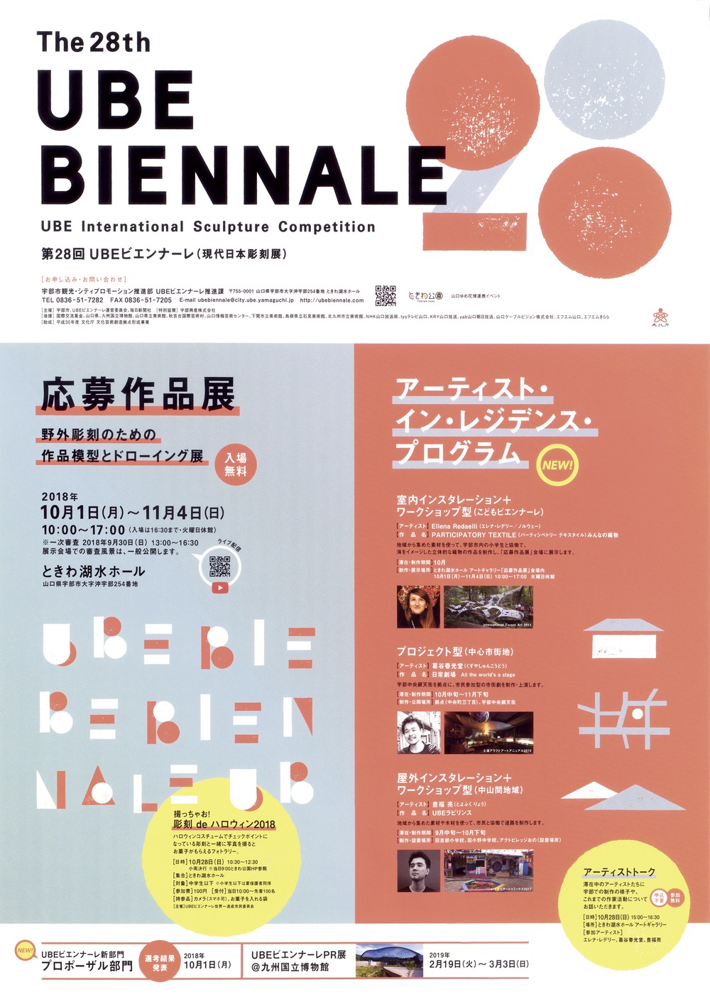 2019年秋開催の第28回展では、42カ国318件の応募のなかから選ばれたイタリア、フィリピン、台湾、日本の4カ国15名のアーティストによる野外彫刻がときわ公園を彩ります。また同時期に市内全域で開催されるUBEビエンナーレ×まちじゅうアートフェスタ(UBEアートフェスタ 2019)では、多彩なアートや食のイベントをお楽しみいただけます。