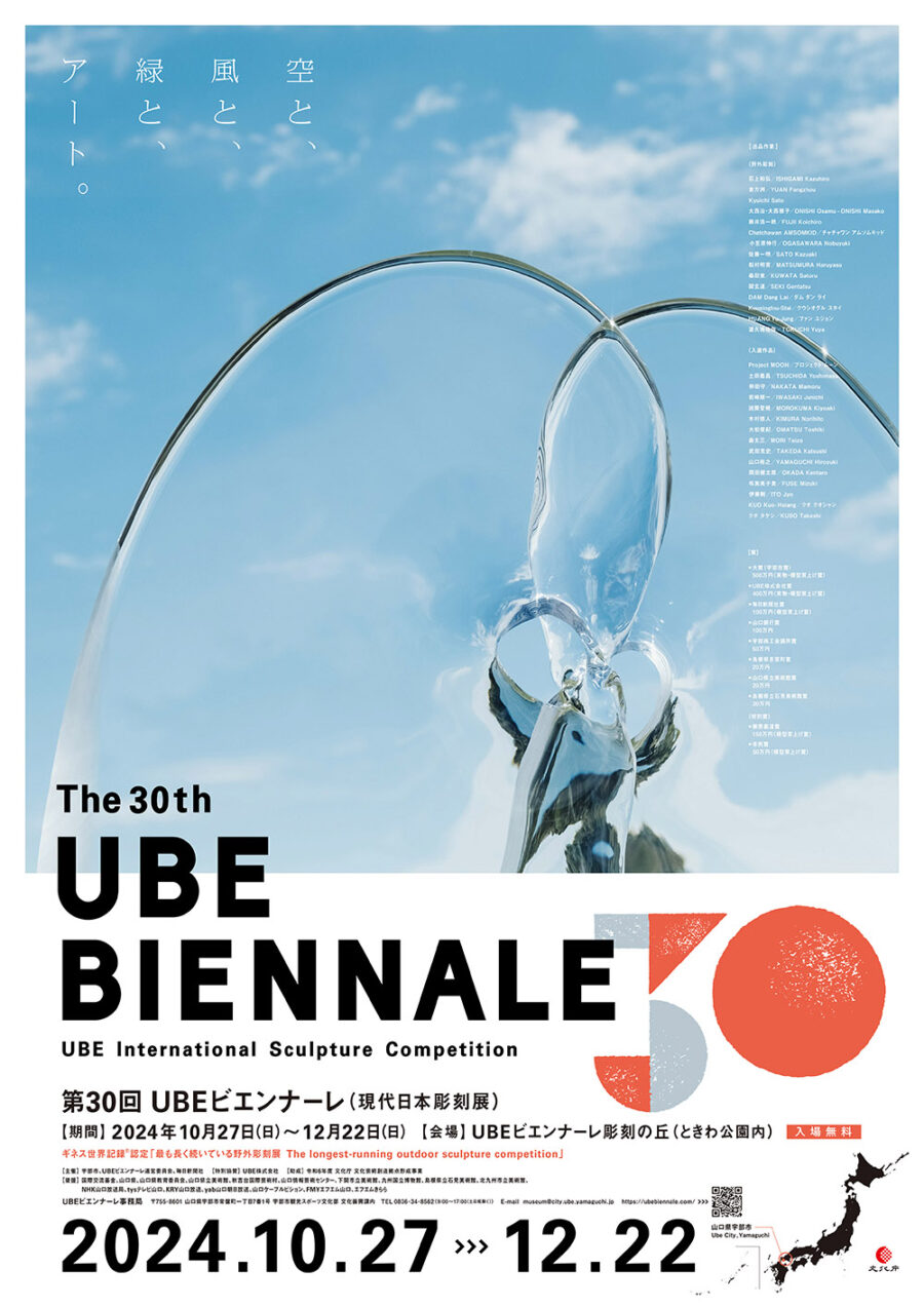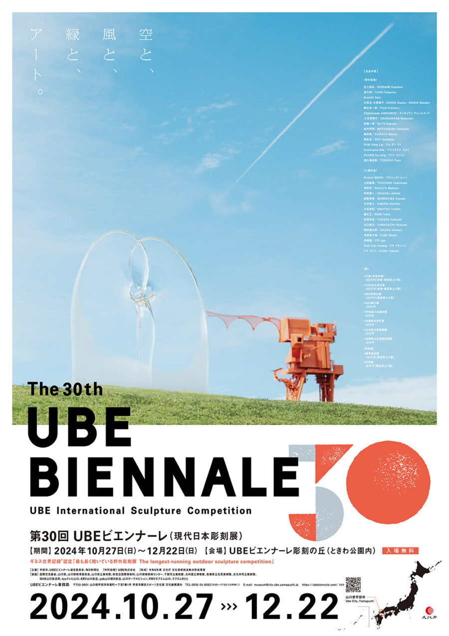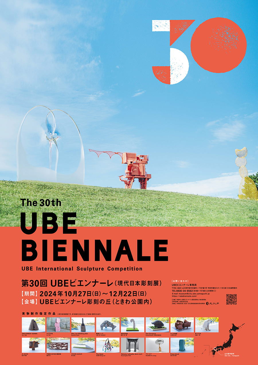 「UBEビエンナーレ(現代日本彫刻展)」は、戦後のまちの美化と心の豊かさを求める市民運動をきっかけとして、1961年から2年に一度の開催を続ける世界で最も歴史ある野外彫刻の国際コンクールです。28か国183点の応募作品の中から一次審査で選ばれた30点の入選模型作品のうち15点の実物制作指定作品が、第30回の節目を迎える2024年秋、約10倍の大きさの野外彫刻となって、常盤湖を望むUBEビエンナーレ彫刻の丘に展示されます。