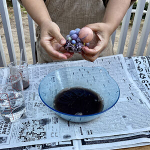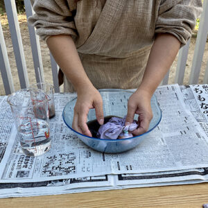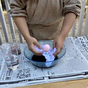 水に染料を混ぜ、布を浸します。