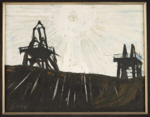 これらの作品が、炭鉱の歴史を伝える貴重な資料であることはもちろんですが、炭鉱町から工業都へと姿を変えてゆく、変化の激しい時代を描いた絵画としても、かけがえないのない郷土資料であるといえます。消えゆく炭鉱町の姿を描いた木村英雄の「廃墟」や、戸野昭治郎による「上宇部の炭鉱」シリーズには、けして寂しいばかりではない、郷土へのあたたかな眼差しが感じられます。また、竹本勘一の「松津炭鉱」や、作者不詳ながら閉山前に描かれたであろう「沖の山炭鉱 貯炭場」には、明るい、あるいは眩しいほどの陽光が降り注いでいるのが印象的です。
