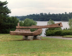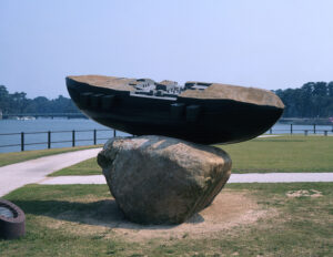 1965年の「砂上櫓」から30年後の、同じく“船”をモチーフとした大賞作品です。受賞当時、井田が30代であったことも共通しています。全体のおおらかなフォルム、自然石の質感、細部の繊細な作り込みが調和し、ひとつの世界観を豊かに表現しており、完成度の高い野外彫刻であることを感じさせます。個々の作品の個性がより多様化するなかで、彫刻を展示する環境としての会場の在り方も再考され、現在のようなニュートラルな会場が整備されたのもこの頃です。現代日本彫刻展の挨拶文には、この展覧会が、「自然と彫刻との調和や新たな都市づくりを追求して」実施されていることが明記されるようにもなりました。