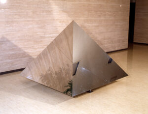 第8回展のテーマは「彫刻のなかのポエジー」でした。このテーマの意図は、決して彫刻でポエジー(詩情)を表現すべしと鼓舞するものではありません。むしろ作者の思いはどうあれ、造形の構築によって制作される彫刻から、いかにしてポエジーが生まれ出ずるのか、そのことを考えようとするものでした。「正五角形のピラミッド」は、ピラミッド型の形体を、断面が正五角形になるように切断し、その上部が回転することで、形容しがたい形体に変化したあと、5回転して、もとの静謐なピラミッドの姿に戻るという電気仕掛けの動く作品です。情緒や思念を削ぎ落としたような形体から、見る人の感情を揺さぶるような結果が生まれた点で、まさにこの回の大賞にふさわしい作品であったといえるでしょう。