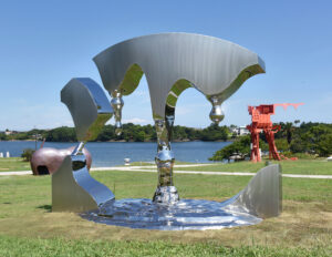 長い歴史のなかで、第4回展(1971年)の多田美波に続いて、大賞を受賞した二人目の女性作家による作品です。ステンレスの鏡面磨きと、鍛金による自由な造形で、水の自在な動きを彫刻としました。背景に見える常盤湖や公園にあふれる光ともよくマッチしています。「アートによるまちづくり」を重点に掲げ、UBEビエンナーレという彫刻の祭典を、来場者に楽しんでもらうことを目指した結果、彫刻の都市空間への意識が、会場であるときわ公園の環境へと強くシフトしている点は、2010年代の特徴と言えるでしょう。