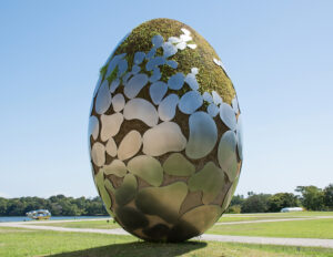 「はじまりのはじまり」は卵というわかりやすいモチーフのなかに、様々な要素を織り込んだ力強い作品です。遠目にもはっきりと形が認識され、近づくと小さな植物たちの栄枯盛衰を眺めることができます。この植物たちはつねに手入れを必要としており、小さな声で、周囲の人々の思い遣りを求めています。恒久性や安定性が好ましいとされる野外彫刻に、意外な視点をもたらしてくれた作品と言えるでしょう。