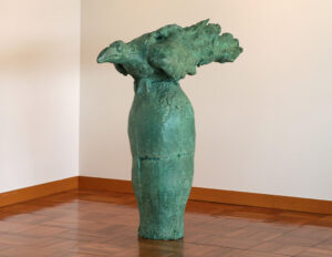 様々な作家が戦後日本の彫刻の新たな形体を求めて挑戦するなか、戦前から一貫して自身の彫刻の道を探求し続けた作家もいます。柳原義達は、向井良吉と並んで、具象・抽象の作家たちを率いて、野外彫刻展を牽引してきた宇部市に縁の深い作家で、第29回UBEビエンナーレ(現代日本彫刻展)からは、柳原の功績を顕彰する柳原義達賞の設置も予定されています。「道標・鴉」は、柳原が生涯取り組んだ“道標”シリーズのひとつで、カラスの生命や動勢を掴みとろうとするその表現は、野外・屋外に関わらず、確固たる存在感を放っています。