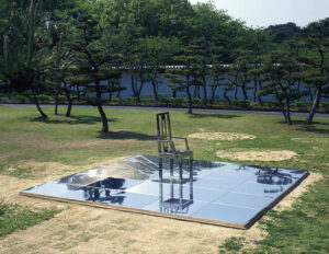 初期の現代日本彫刻展では、各回ごとにはっきりとしたテーマが設けられていました。第3、4回展は、戦後の新素材であるステンレス、アルミニウム、プラスチック、強化プラスチックがテーマとなりました。その後、第5回展では「形と色」、第6回展では「彫刻のモニュマン性」。第7回展のテーマは「現代彫刻の抽象と具象と」でした。抽象か具象かという話題が盛んだった時代は過ぎていましたが、野外彫刻の都市での役割を見つめ直すうえで、再度この問題に目を向けようという意図があったようです。「孤独の輪郭」は、椅子をモチーフとしている点で具象かもしれませんが、地面に敷かれたステンレス板は空を映し、椅子は虚空に浮かぶ玉座のようで、非現実的な印象を与えます。周囲の環境を取り込みつつも、社会の喧騒とは一線を画す、心象風景のような、叙情的な作品です。