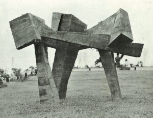 野外という自由で開放的な彫刻展会場は、作家たちにとって、素材と形の新たな可能性を探る熱心な実験の場となりました。ブロンズに代わる安価な材料であったコンクリートは、1950年代後半~1960年代前半までよく使われました。「門V・a」もそんなコンクート作品のひとつで、直線的な形で構成された抽象作品です。表面に打設の際の型枠の跡を見ることができます。