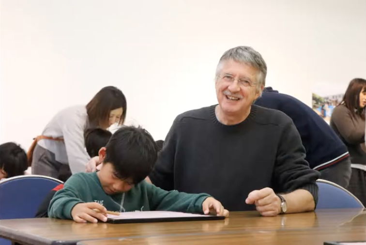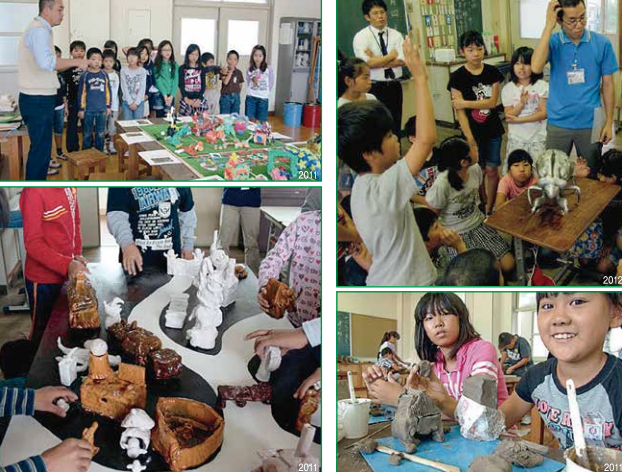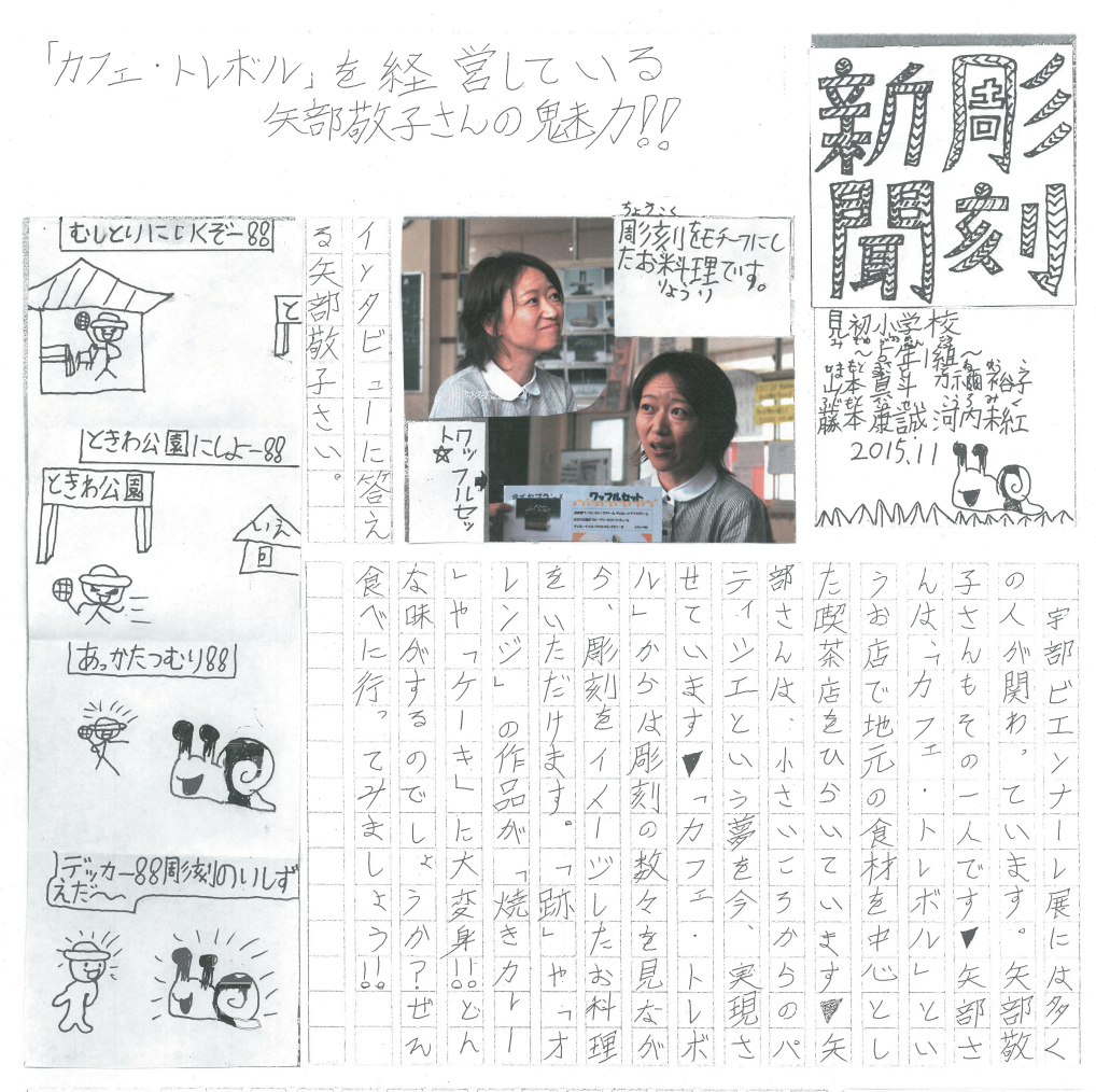 UBEビエンナーレ会場で、見初小学校5年生による彫刻新聞を配布しています。