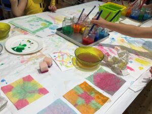 写真右:「夏の美術室2024 素材とかたち からだであそぼう」ワークショップ参加児童作品 左:素材体験「のんびり美術ラボ」水彩絵の具の日参加児童作品