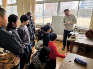 写真左:「制作体験」小学校6年生、右:「講話」中学校1年生