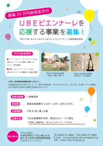 平成27年11月29日までに完了する事業で、以下のいずれかに該当するもの 市内で実施するUBEビエンナーレに関連したアートイベント UBEビエンナーレ関連グッズ等の開発・販売事業 その他UBEビエンナーレと関連又は連携する事業